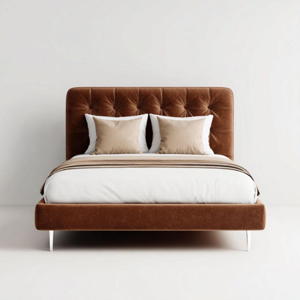 Matériaux : Structure en bois composite (pin massif, contreplaqué, MDF), pieds en acier chromé, rembourrage en mousse de polyuréthane, revêtement en velours polyester